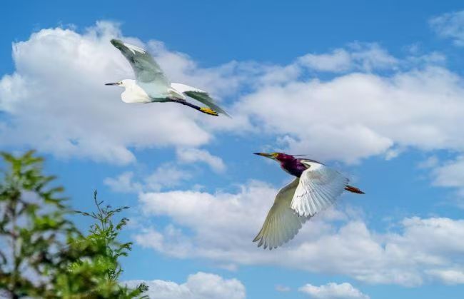 白鷺和池鷺在女媧湖上自由飛翔 肖海清 攝