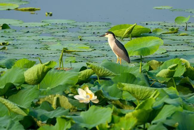 2024年6月24日,河南省周口市西華縣女媧湖濕地公園裏的水鳥各自展現著獨特的風姿,它們或自在遊弋,享受著湖水的溫柔懷抱;或潛水覓食,展現著生存的智慧;或打逗嬉鬧,傳遞著生命的歡樂;或展翅飛翔,追逐著自由的夢想,構成了一幅美麗的畫卷。圖為藍天下靜美的女媧湖濕地公園。肖海清 攝